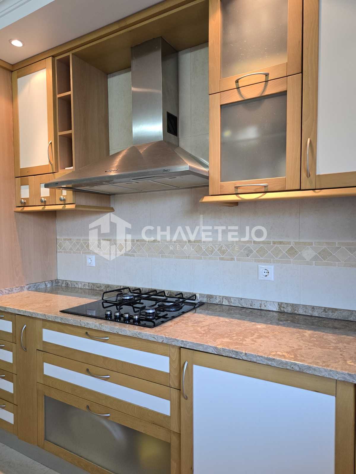 From the lounge, there is access to a well-proportioned kitchen, which is fully tiled and fitted with ample storage cupboards, granite worktops, and built-in appliances including a fridge, dishwasher, hob, and extractor fan, with space allocated for an oven. The kitchen offers generous preparation space and comfortably accommodates a dining table, making it ideal for family life and entertaining. A pantry within the kitchen provides valuable additional storage, and next to it there is a door leading directly to the rear terrace, ideal for outdoor dining.