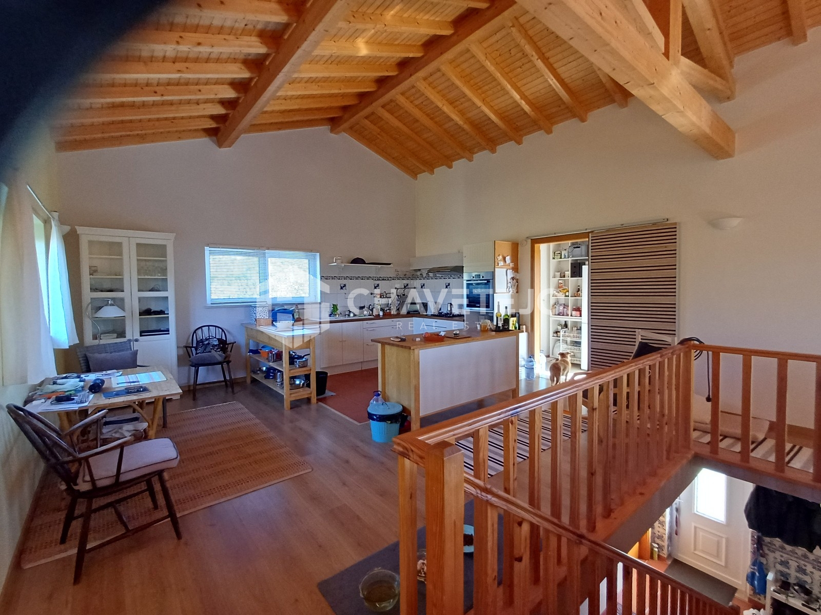 On the left side of the corridor, we have an attractive wooden staircase leading to the first floor, which is ample space. We arrive in a spacious sun-flooded room with a beautiful wooden vaulted ceiling. The lounge area is to the left, with a triple glass door to the balcony, inviting you to admire the wonderful views while having your breakfast, meal, or a glass of wine at the table, or relaxing on the couch facing the very efficient wood burner. The wood burner creates a toasty atmosphere during the chilly winter times.