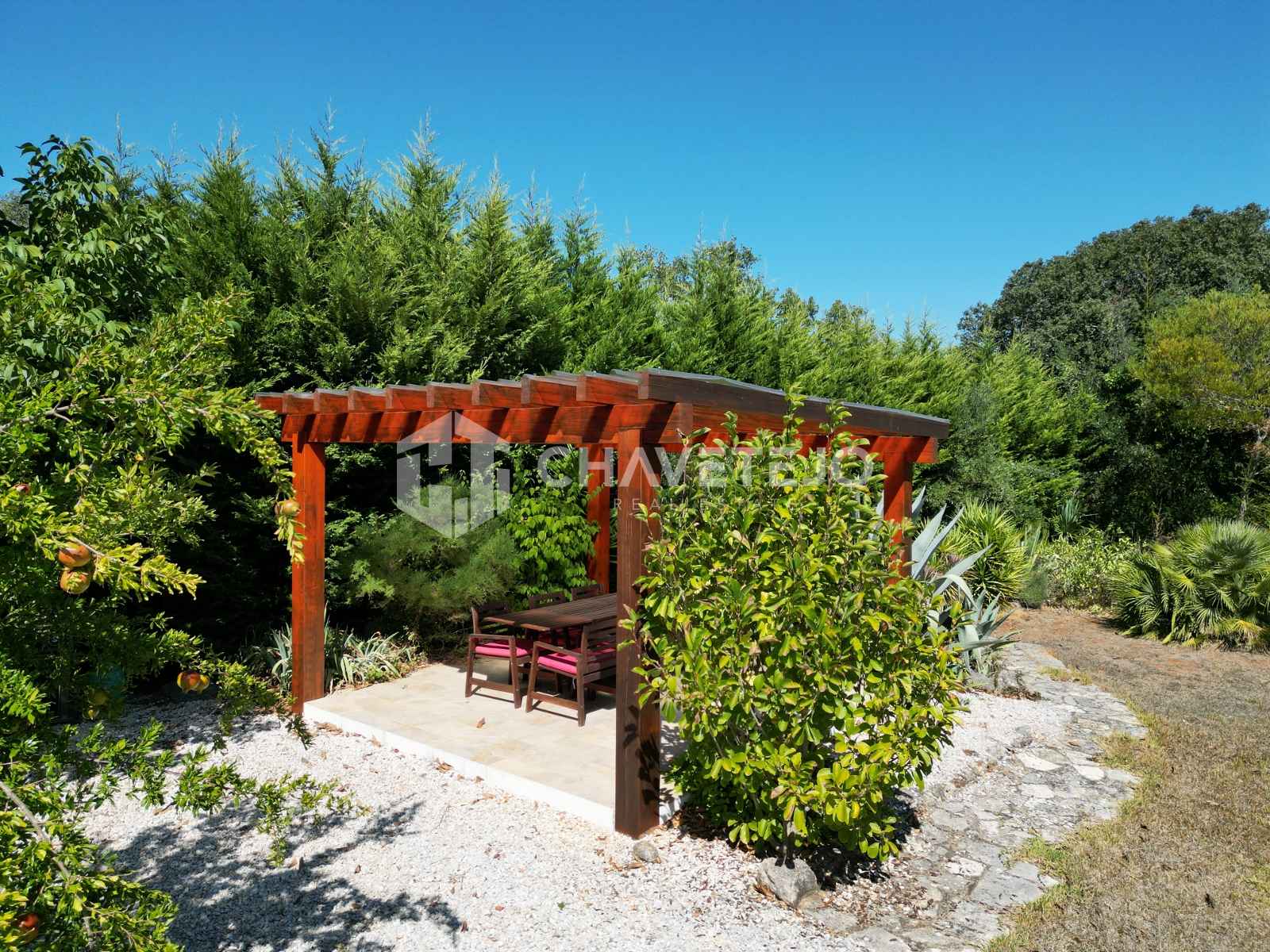 Walled garden is truly beautiful and mature, thoughtfully landscaped with lawns, paved paths, and olive trees.