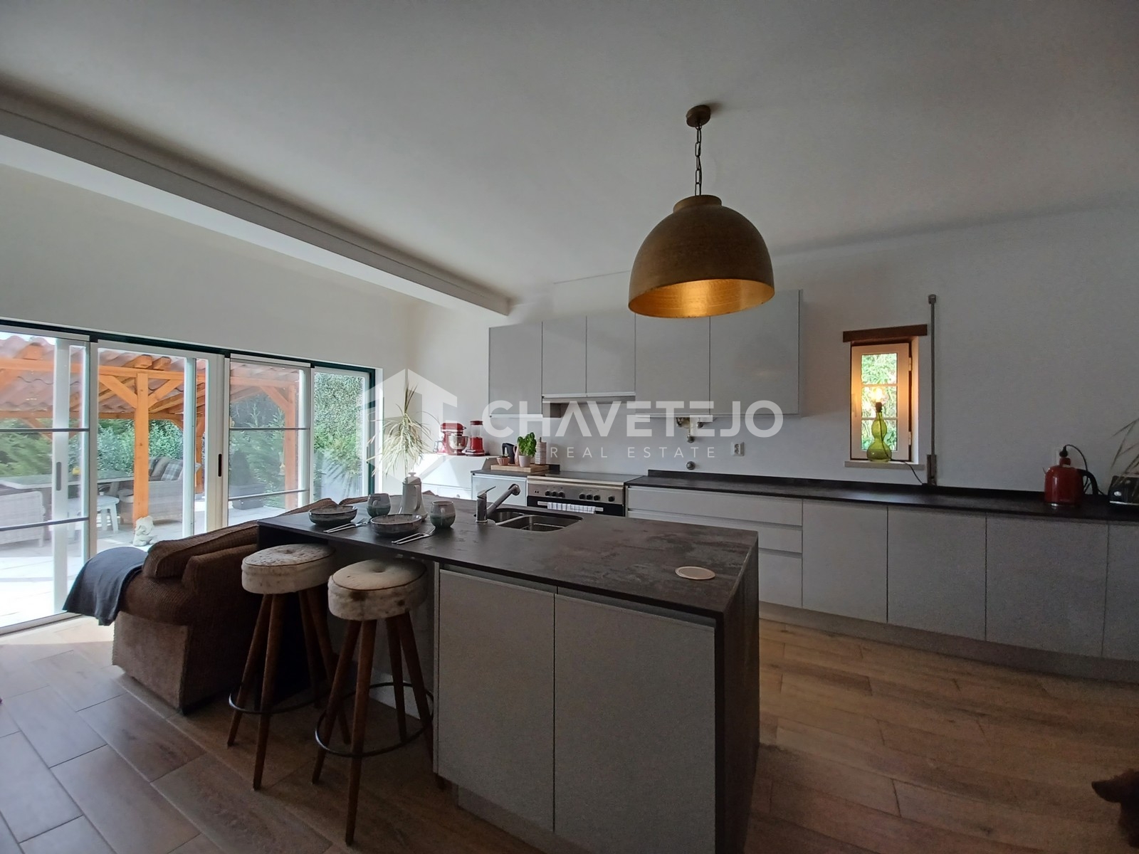 The kitchen has been beautifully renovated, showcasing a sleek, modern design with abundant storage. A central island features a sink and additional cupboards beneath, complemented by elegant countertops that enhance the overall style. One side of the kitchen provides extra storage with a built-in microwave, while there is a designated space for a freestanding fridge. There's also a range cooker, and an integrated dishwasher in the breakfast bar. A wood-burning stove is tucked into one corner, adding both charm and functionality. Sliding patio doors open directly onto the covered area at the rear, creating a seamless connection between indoor and outdoor living.